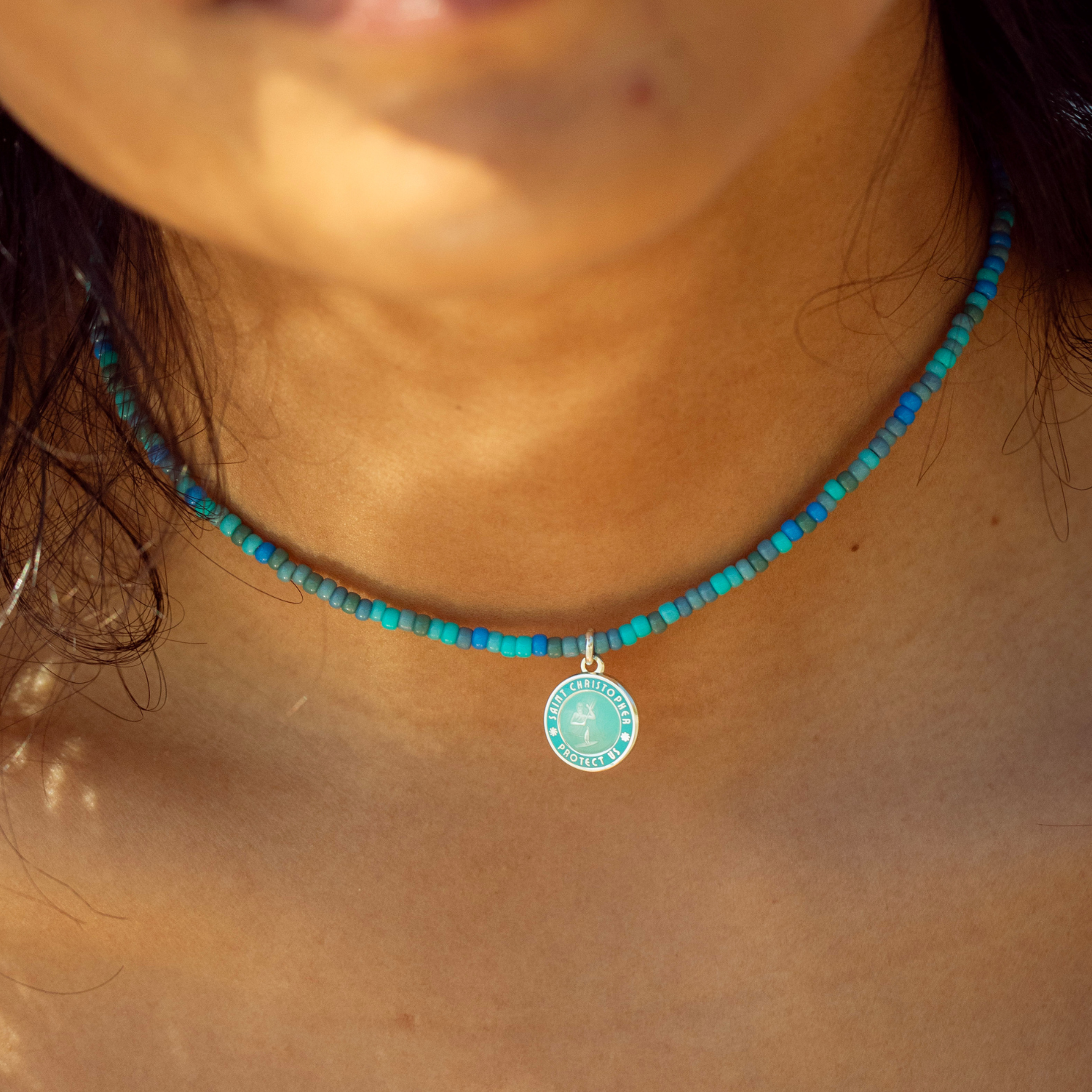 Plongez dans l'aventure avec le ras-de-cou Blue Lagoon ! Orné de perles de rocaille bleues éclatantes et d'un pendentif Saint-Christophe bleu sarcelle, ce ras-de-cou est fait pour les amoureux de l'océan et les explorateurs. Portez-le comme un symbole de protection et un souvenir des innombrables journées d'été au bord de la mer.