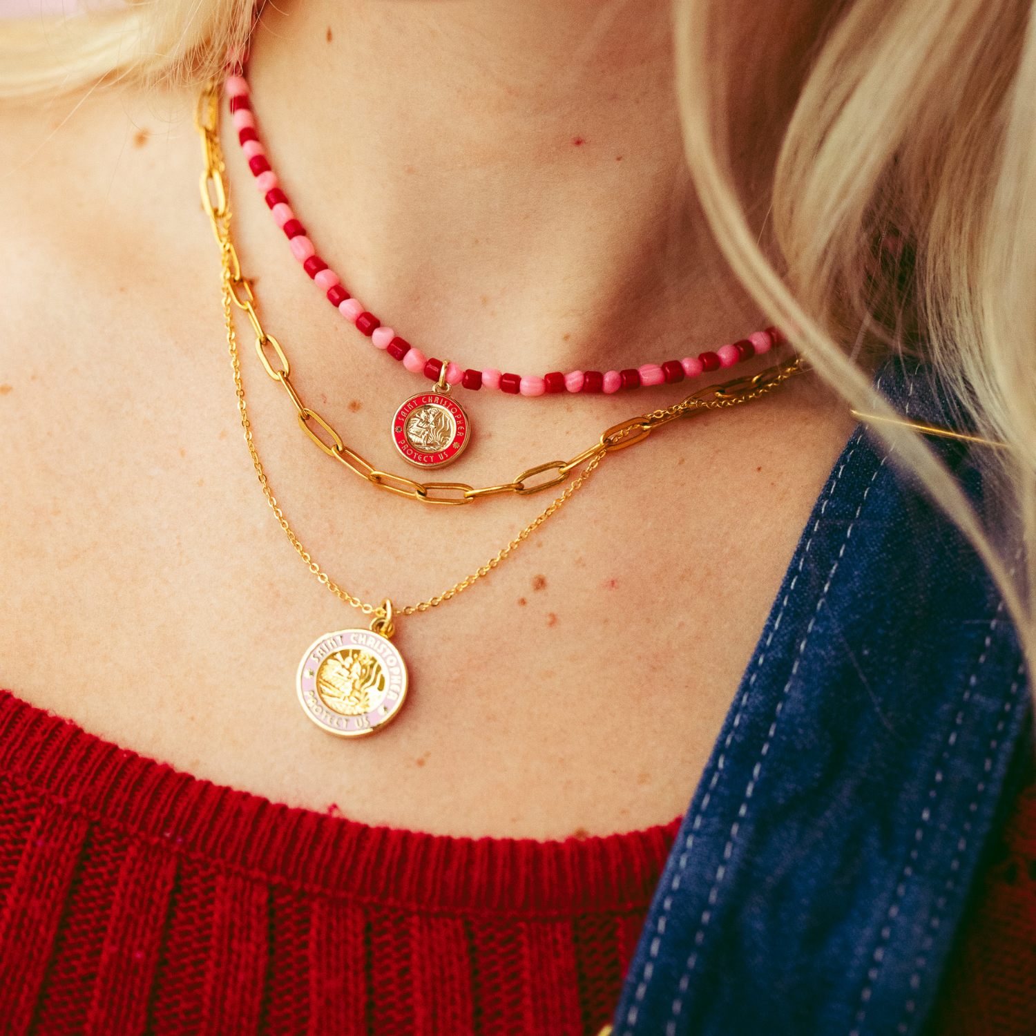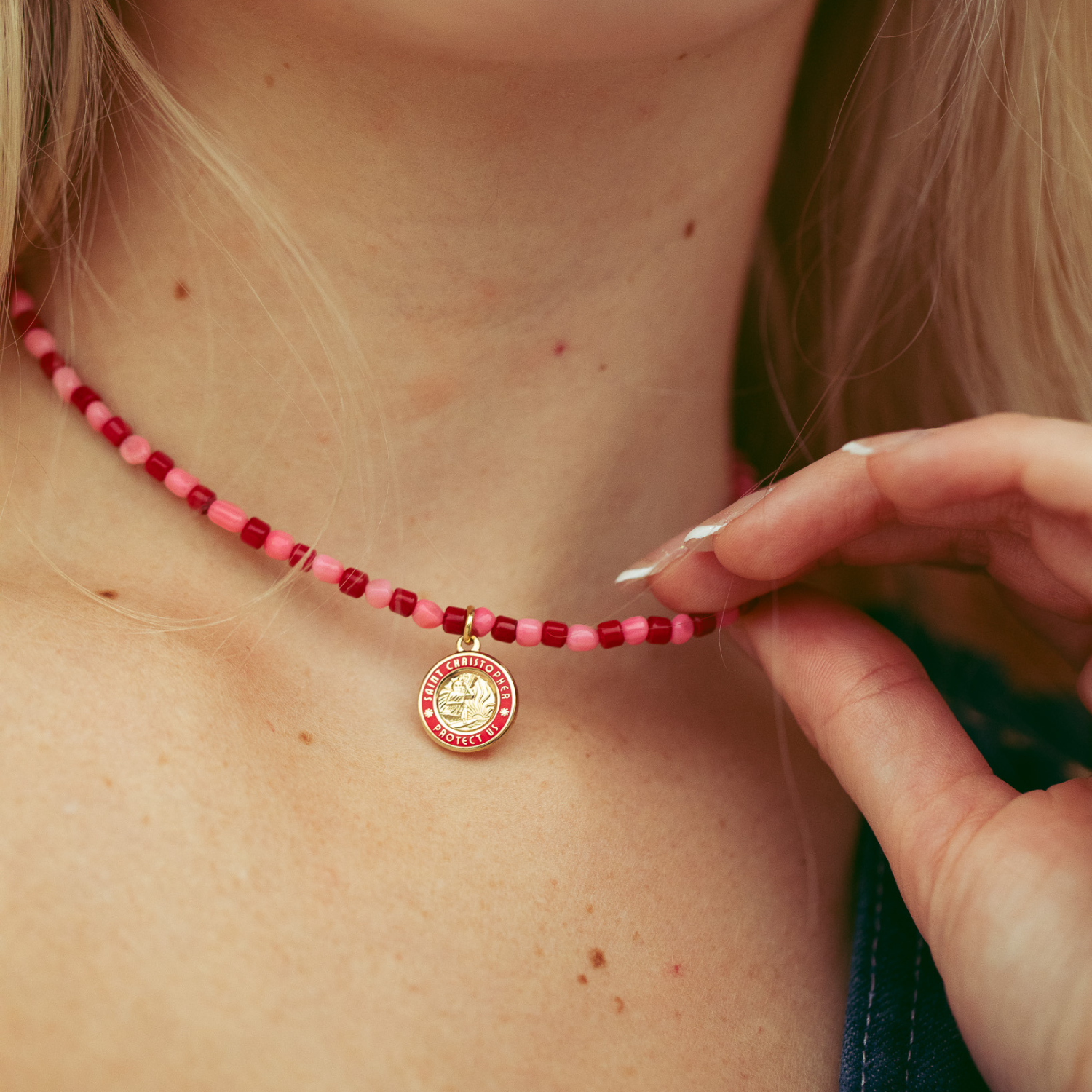 Célébrez l'amour et l'aventure avec le ras-de-cou Cœurs de Feu, l'accessoire parfait pour la Saint-Valentin et bien plus encore. Orné de perles rouges et roses éclatantes et d'un magnifique pendentif Saint-Christophe rouge et doré, ce ras-de-cou allie l'esprit de l'amour à l'ambiance décontractée de la plage. Conçu pour capturer l'essence de la protection et du voyage, il est idéal pour toutes celles qui aiment le style côtier et les bijoux intemporels Saint-Christophe. Parfait pour offrir ou se faire plaisir avec une touche d'amour inspirée par la mer !