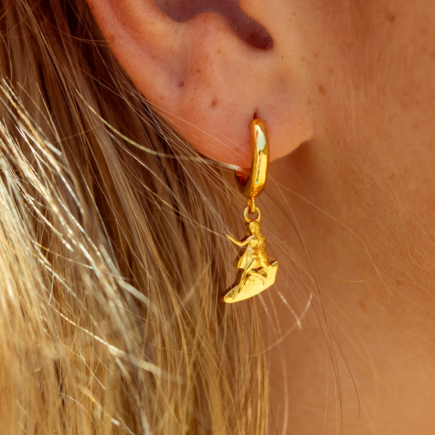 Les boucles d'oreilles Notre-Dame des Vagues sont enfin arrivées ! Ornées de l'emblématique Dame de G surfant sur les vagues, ces mini-breloques plaquées or apportent une touche marine à votre style quotidien. Légères, parfaites pour la plage et confectionnées en acier inoxydable plaqué or 18 carats, elles se portent seules ou associées au collier et à la bague assortis pour un effet surf complet.