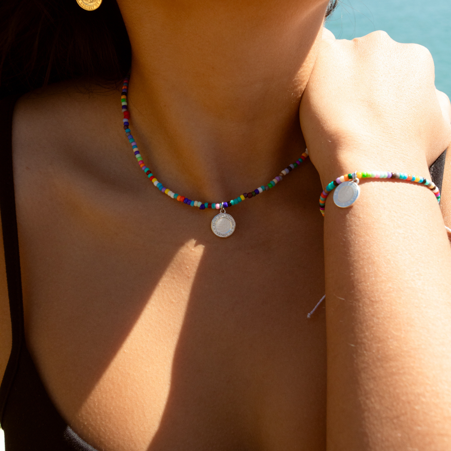 Vous l'avez demandé, et le voici de retour ! Notre collier ras-de-cou Rainbow Bead, orné du pendentif emblématique Saint-Christophe, est de retour. Doté d'un fermoir mousqueton et d'une chaînette d'extension, cet accessoire éclatant est prêt à illuminer votre style. Ne manquez pas ce bijou incontournable !