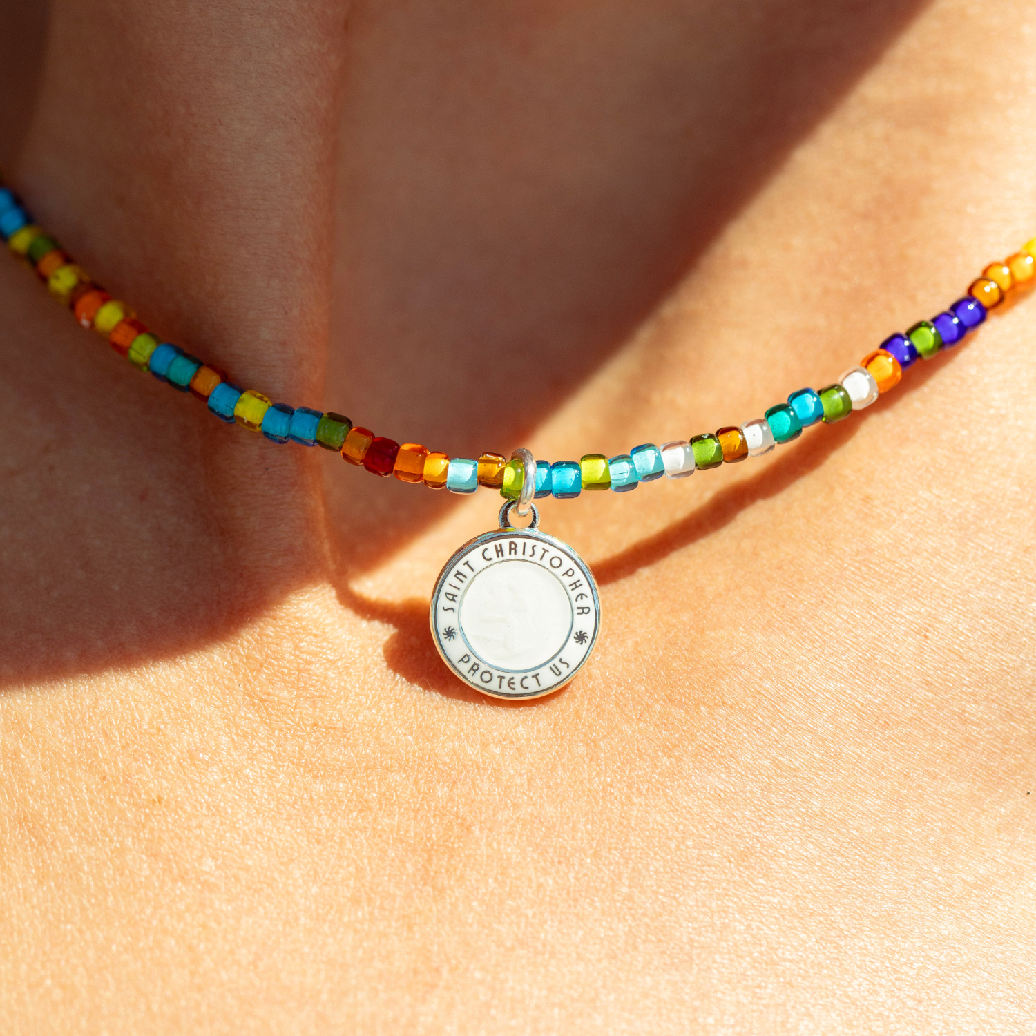 Ajoutez une touche de couleur à vos aventures avec le ras-de-cou rétro arc-en-ciel ! Composé d'un mélange vibrant de perles de rocaille colorées et d'un petit pendentif Saint-Christophe blanc, ce ras-de-cou allie à la perfection style surf vintage et porte-bonheur. Portez-le seul ou superposez-le pour un look plage irrésistible ! Cordon en nylon ciré. Longueur ajustable de 5 à 12,5 cm. Perles de rocaille japonaises multicolores. Petit pendentif Saint-Christophe blanc.