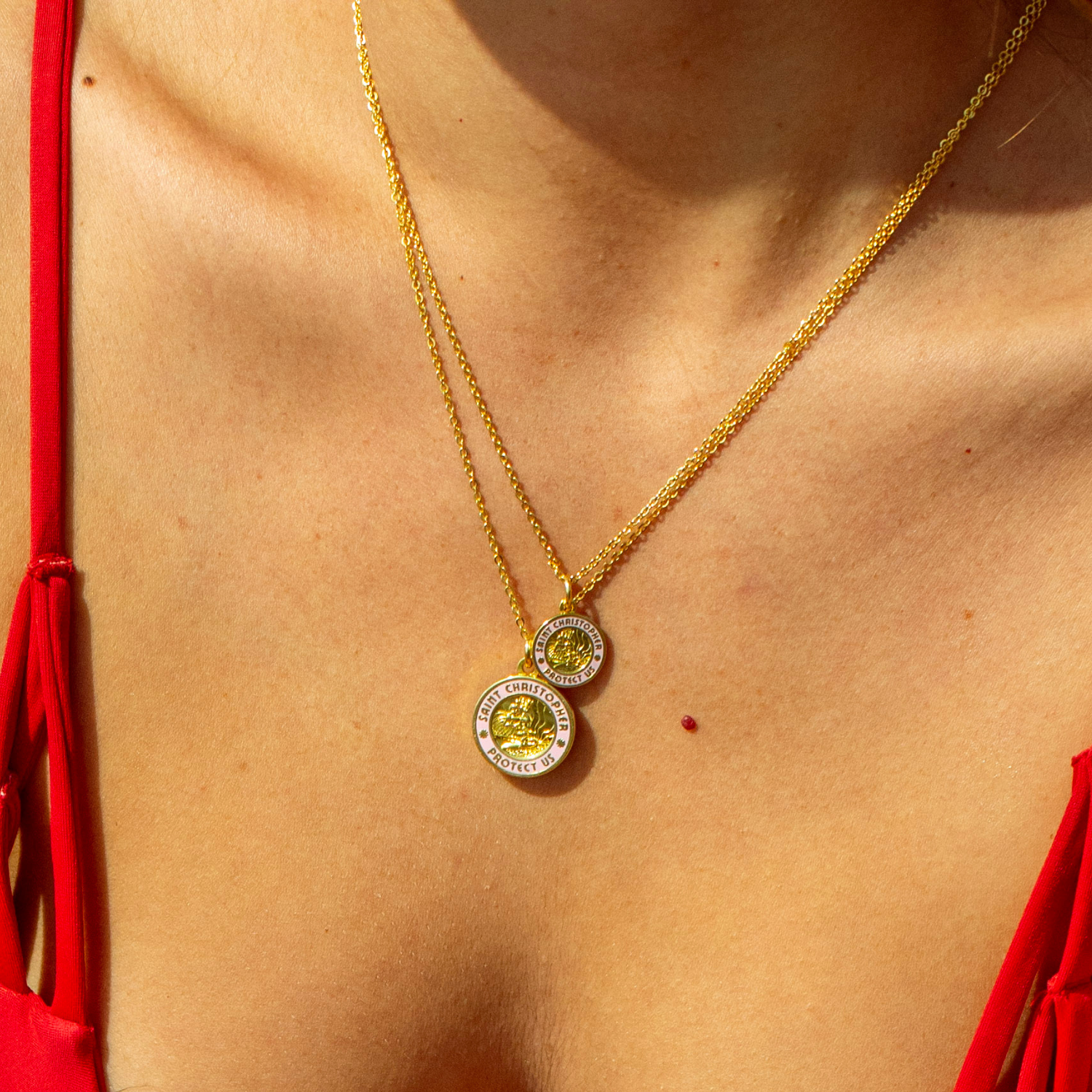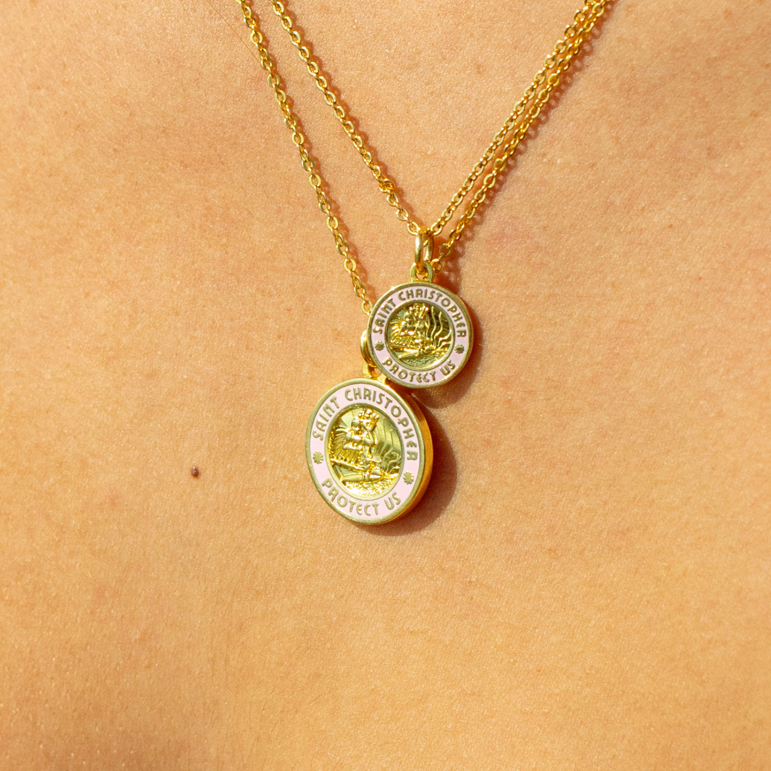 Pour les amoureux de l'or <3 Notre collier classique Saint-Christophe or rose est de retour, plus beau que jamais, avec un liseré en émail rose clair. Quantités limitées, alors ne tardez pas !