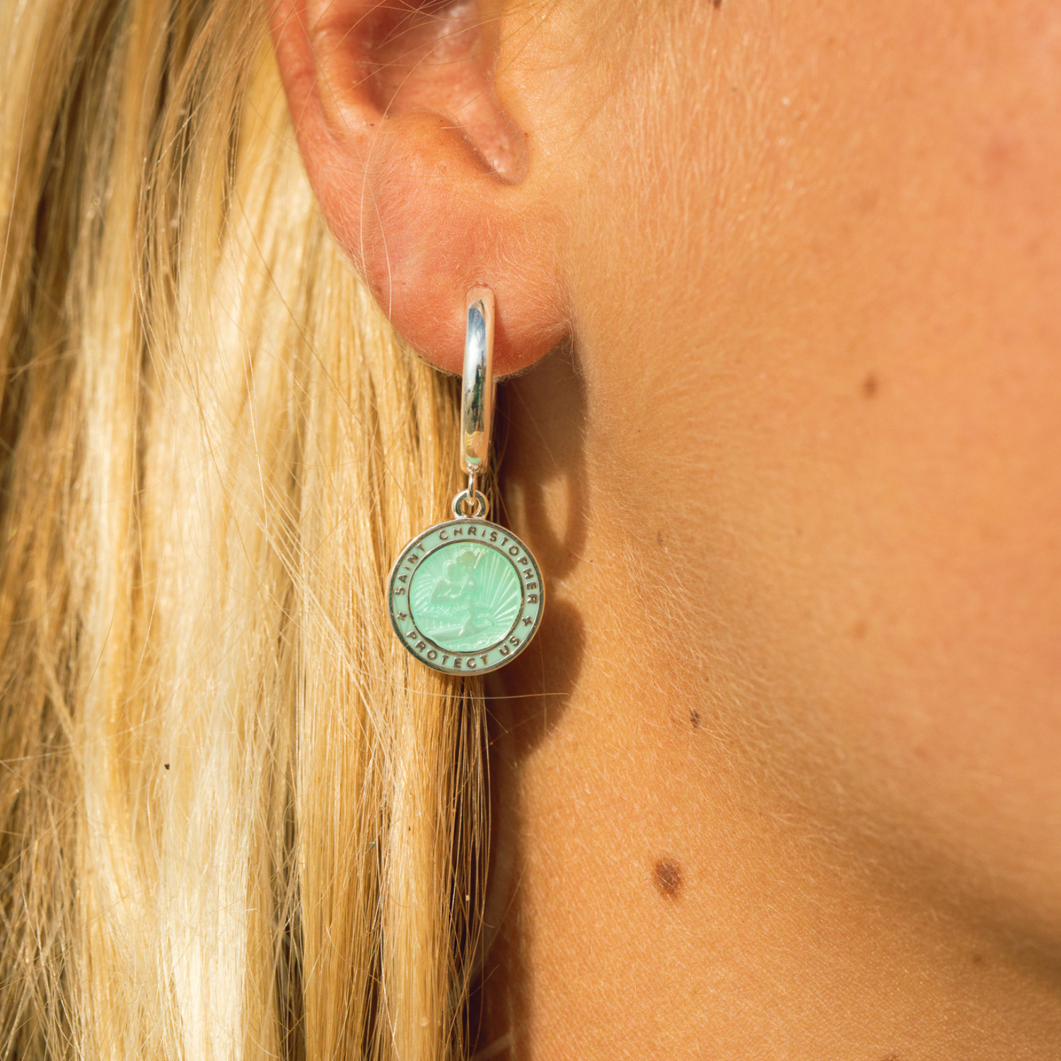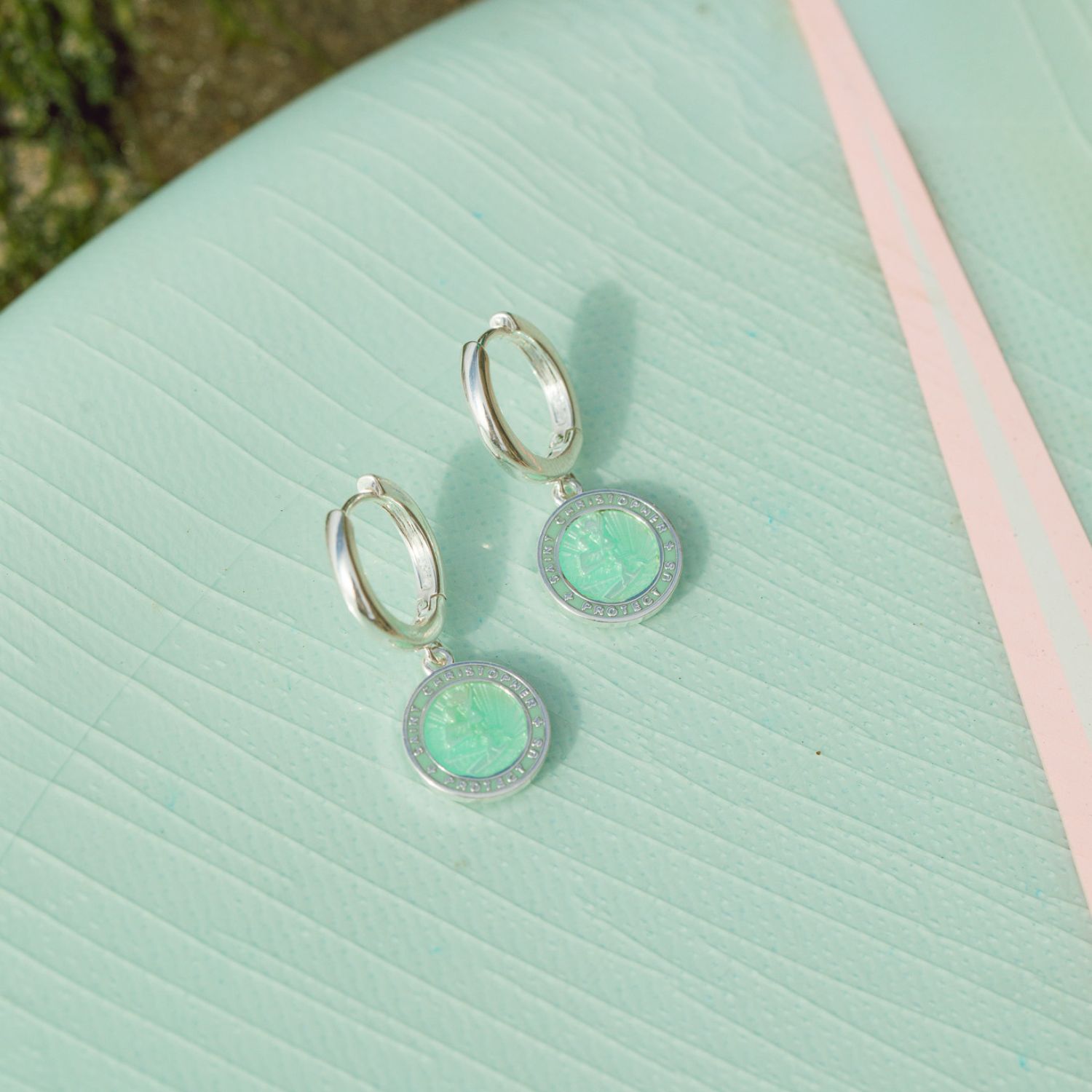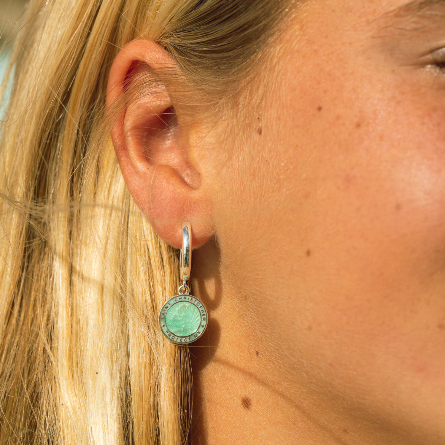 Restez protégée avec style grâce à nos boucles d'oreilles Saint-Christophe d'un magnifique vert d'eau ! Légères et éclatantes, elles allient charme et élégance d'inspiration côtière à toutes vos tenues.